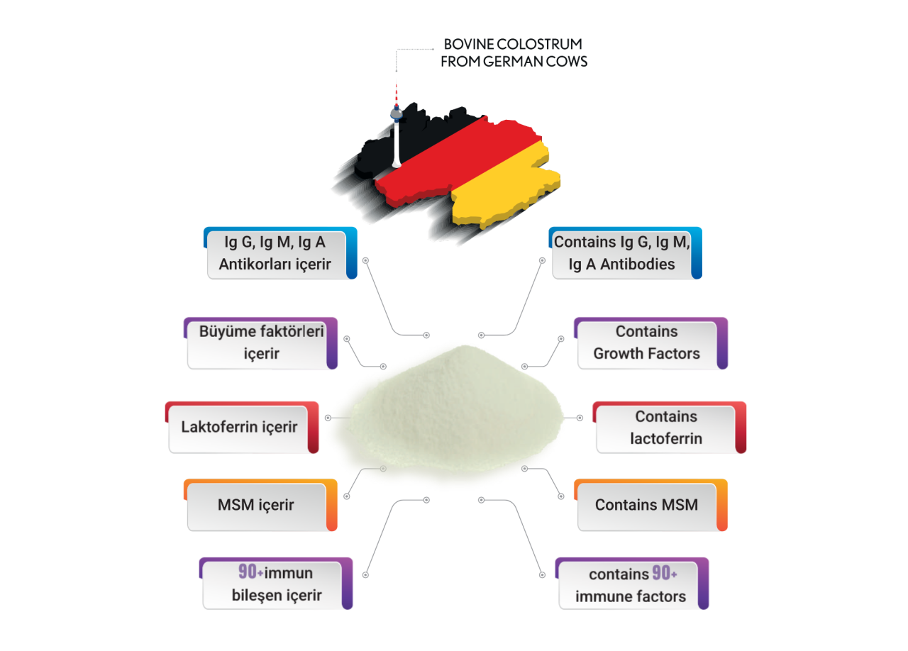 Bovine kolostrumun içinde yer alan Laktoferrin, güçlü antiviral ve antimikrobiyal özellikleri ile bilinir ve inflamasyona sebep olan patojenleri etkisiz hale getirme yeteneği ile öne çıkar. Yeni araştırmalar laktoferrinin, bazı enfeksiyonlara karşı mevcut tedavilerden daha etkili olabileceğini ortaya koymaktadır. New Haven Üniversitesi’nde yapılan yeni bir araştırma, laktoferrinin (kolostrumdaki süt proteini) Lyme hastalığının tedavisine yardımcı olabileceğini buldu. (1).